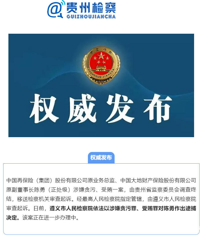 11月30日,貴州省人民檢察院通報,中國再保險(集團)股份有限公司原業(yè)務(wù)總監(jiān)、中國大地財產(chǎn)保險股份有限公司原副董事長陳勇(正處級)涉嫌貪污、受賄一案,由貴州省監(jiān)察委員會調(diào)查終結(jié),移送檢察機關(guān)審查起訴。