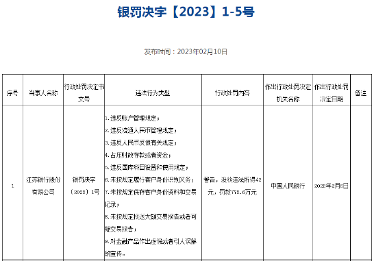 針對(duì)上述違法行為,中國(guó)人民銀行對(duì)江蘇銀行處以警告,沒(méi)收違法所得42元,并罰款773.6萬(wàn)元。行政處罰決定日期為2023年2月6日。