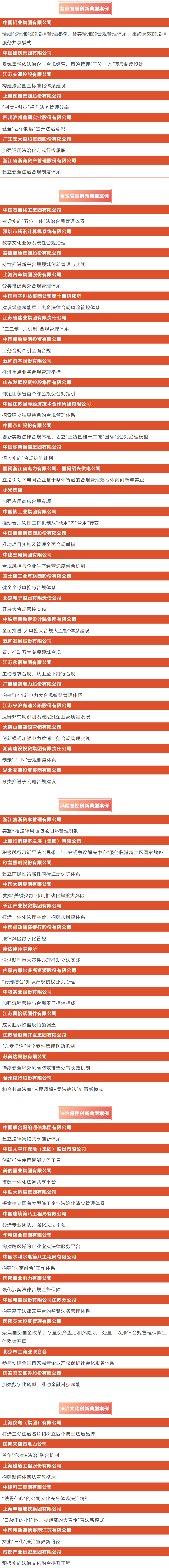 經(jīng)過一個(gè)多月的征集、篩選和專家評(píng)議,最終從353個(gè)案例中產(chǎn)生“制度管理創(chuàng)新典型案例”“合規(guī)管理創(chuàng)新典型案例”“風(fēng)險(xiǎn)管控創(chuàng)新典型案例”“法治保障創(chuàng)新典型案例”“法治文化創(chuàng)新典型案例”5個(gè)類別共66個(gè)典型案例。結(jié)果如下(排名不分先后):