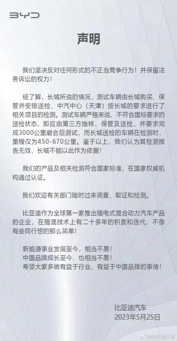 比亞迪稱,經(jīng)了解,長城所說的情況,測試車輛由長城購買、保管并安排送檢,中汽中心(天津) 按長城的要求進行了相關(guān)項目的檢測。測試車輛嚴格來說,不符合國標要求的送檢狀態(tài),即應(yīng)由第三方抽樣、保管及送檢,并要求完成3000公里磨合后測試,而長城送檢的車輛在檢測時,里程僅為450-670公里。鑒于以上,比亞迪認為其檢測報告無效,長城不能以此作為依據(jù)。