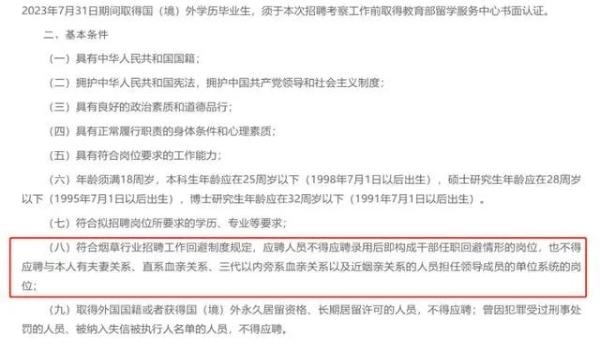 比如青海省煙草專賣局(公司)于7月13日發(fā)布的2023年高校畢業(yè)生招聘公告,同樣明確提出:應(yīng)聘人員不得報考與本人有夫妻關(guān)系、直系血親關(guān)系、三代以內(nèi)旁系血親關(guān)系以及近姻親關(guān)系的人員所屬市州局(公司)相關(guān)崗位。應(yīng)聘人員的直系親屬、三代以內(nèi)旁系血親以及近姻親有在青海煙草系統(tǒng)工作的,報名時須如實說明。故意隱瞞不報的,一經(jīng)查實,直接取消考試或錄用資格;已經(jīng)錄用的,依法解除勞動關(guān)系。