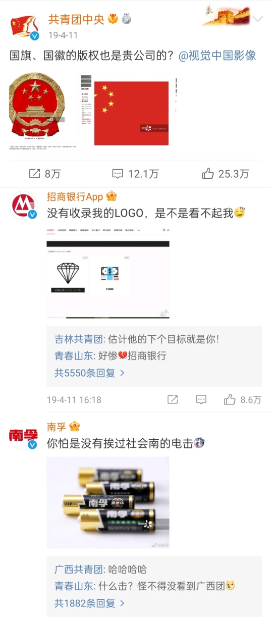 2019年4月11日,“共青團(tuán)中央”官微點(diǎn)名視覺中國并質(zhì)疑:“國旗、國徽的版權(quán)也是貴公司的?”隨后,一眾藍(lán)V排隊(duì)評(píng)論自家LOGO也被視覺中國收入囊中,甚至連歷史書上的人物圖也被視覺中國明碼標(biāo)價(jià),成為其牟利之物。