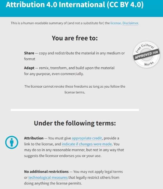 知識(shí)共享署名4.0國際許可協(xié)議,允許使用者用于商業(yè)用途,但不得應(yīng)用法律條款或技術(shù)措施來合法限制他人執(zhí)行許可證允許的任何操作。 截圖自CC官網(wǎng)。