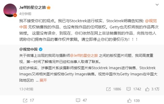 “我不接受你們的觀點(diǎn)。我已與Stocktrek進(jìn)行核實(shí),Stocktrek明確告知我: @視覺中國 無權(quán)銷售我的作品,也沒有我作品的任何版權(quán)。Getty也無權(quán)將我的作品再次轉(zhuǎn)授。這里沒有誤會(huì),到現(xiàn)在,你們依然在網(wǎng)上非法銷售我的作品,向我與他人謊稱你們擁有作品的著作權(quán)并索賠。請(qǐng)立即停止你們的侵權(quán)行為!”