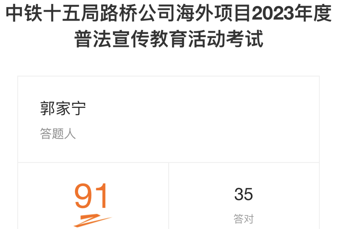 活動(dòng)期間,公司境外項(xiàng)目開(kāi)展線上法律知識(shí)測(cè)試活動(dòng),試卷內(nèi)容涉及憲法、民法 、安全生產(chǎn)法等法律法規(guī)知識(shí),深入貼合職工生活和工作實(shí)際,針對(duì)性強(qiáng)。通過(guò)以考促學(xué)、以考促用,為建設(shè)法治路橋、平安路橋提供堅(jiān)強(qiáng)有力保障。