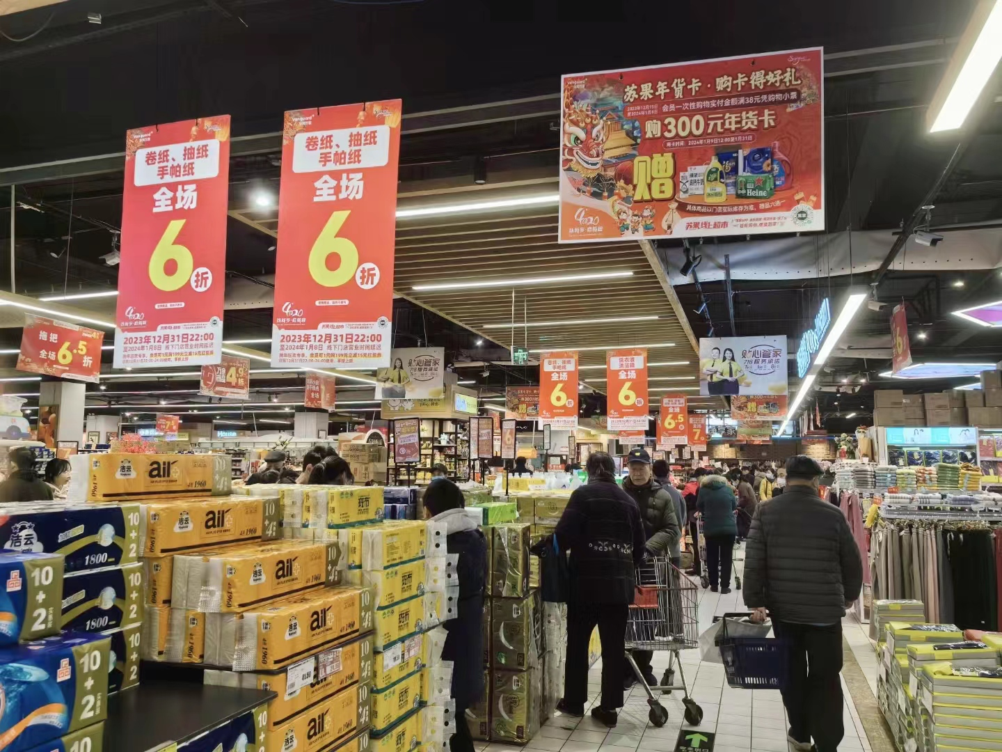 元旦期間,南京市鼓樓區(qū)一家大型蘇果門店,豐富的商品、給力的折扣,年節(jié)氛圍十分濃郁。消費(fèi)者手推購(gòu)物車在貨架前選購(gòu)心儀的商品,同時(shí)也把“美好生活”的向往裝進(jìn)了購(gòu)物車。