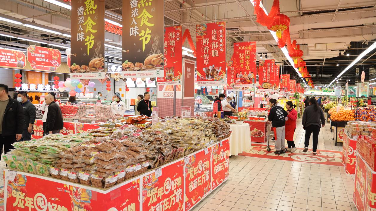 在蘇果南京將軍大道店,喜氣洋洋的龍年年貨節(jié)海報(bào)、吊旗裝飾了整個賣場,各式休閑食品、酒水、牛奶酒水禮盒,鮮活的水產(chǎn)、新鮮的果蔬、來自全國各地的土特產(chǎn)、龍年飾品、吉祥物等琳瑯滿目,蘇果超市“年貨節(jié)”呈現(xiàn)一片紅火和欣欣向榮的熱鬧景象。不少消費(fèi)者推著購物車提前選購心儀的年貨和伴手禮?!懊磕甑倪@個時(shí)候家里都會提前備年貨和福字紅包等年節(jié)商品,錯開節(jié)前一周的購買高峰?!笔忻裰馨⒁瘫硎尽?/p>