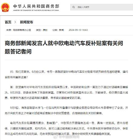 商務(wù)部新聞發(fā)言人就中歐電動汽車反補(bǔ)貼案有關(guān)問題答記者問。