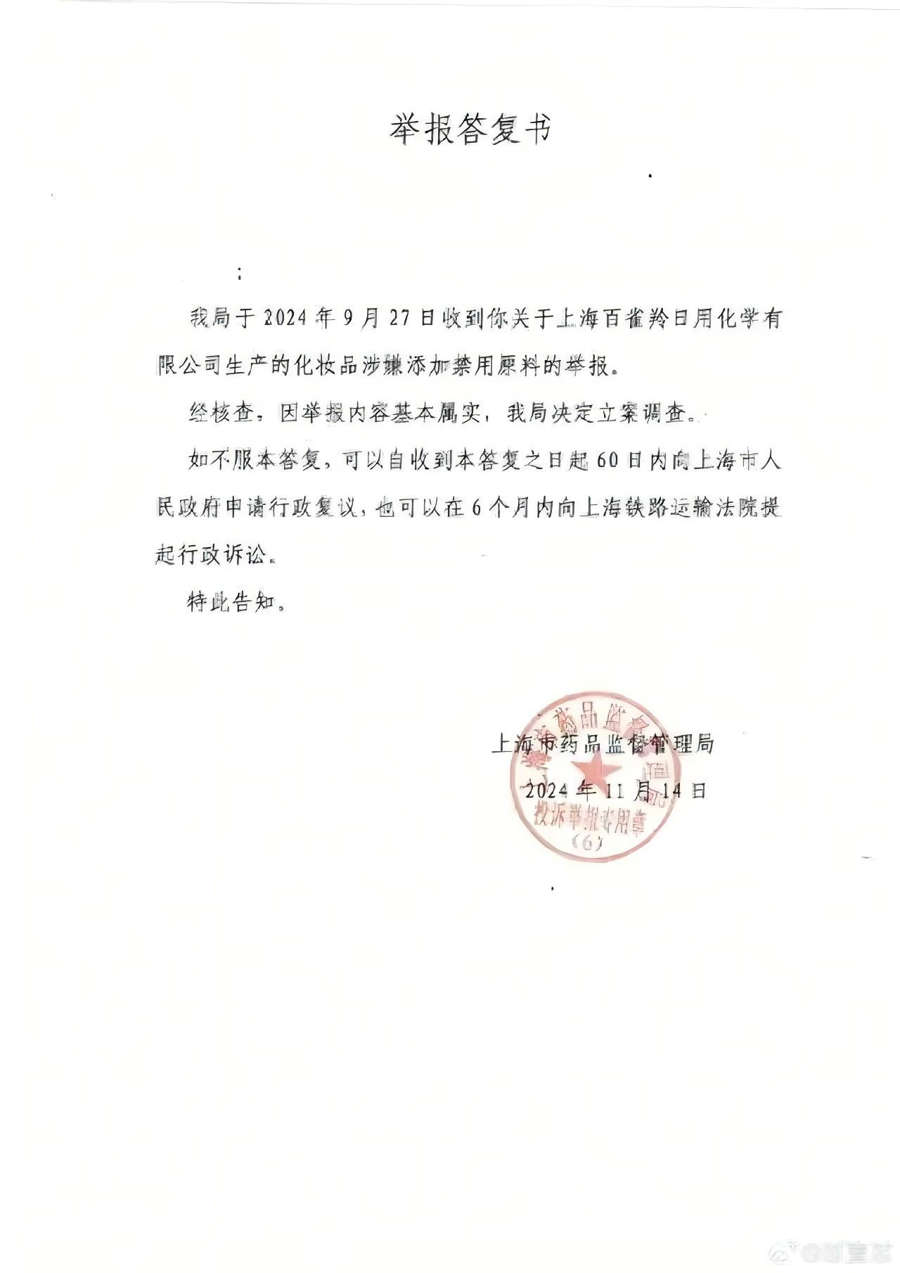 11月19日晚,有博主發(fā)文稱,百雀羚生產(chǎn)的化妝品涉嫌添加禁用原料,同時貼出了上海市藥監(jiān)局舉報答復(fù)書。該答復(fù)書蓋有上海市藥監(jiān)局投訴舉報專用章,其中提到,“經(jīng)核查,因舉報內(nèi)容基本屬實,我局決定立案調(diào)查。”在該微博發(fā)布幾個小時后,“百雀羚化妝品涉嫌添加禁用原料”相關(guān)話題于11月20日早上登頂熱搜。