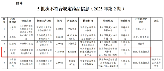 4月7日,江蘇省藥品監(jiān)督管理局發(fā)布關(guān)于江蘇省2025年第2期藥品質(zhì)量的通告(2025年 第2號)顯示,經(jīng)常州市食品藥品纖維質(zhì)量監(jiān)督檢驗(yàn)中心檢驗(yàn),迪賽諾制藥生產(chǎn)的爐甘石洗劑(藥品規(guī)格:100ml/瓶、批號:47240704)不符合規(guī)定,藥品不合格項(xiàng)目為微生物限度,檢驗(yàn)依據(jù)為國家藥品監(jiān)督管理局標(biāo)準(zhǔn)WS1-XG-012-2020。