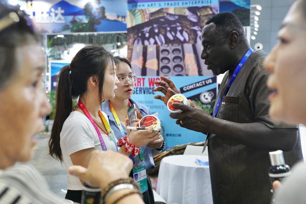 不遠(yuǎn)處的布隆迪展區(qū),當(dāng)?shù)卦现圃斓睦蹦咀延汀⒗蹦咀焉眢w香膏也吸引著不少專業(yè)觀眾前來(lái)問(wèn)詢、試用。短短半天,已有20多個(gè)采購(gòu)商留下對(duì)接方式。