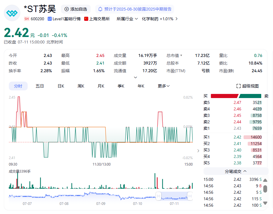 截至7月11日,*ST蘇吳股價(jià)報(bào)2.42元/股,總市值17.23億元。截至2025年3月31日,公司股東達(dá)到8.6萬(wàn)戶。