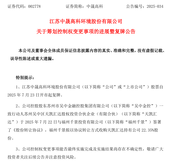 7月22日晚,中晟高科發(fā)布《關(guān)于籌劃控制權(quán)變更事項(xiàng)的進(jìn)展暨復(fù)牌公告》稱,公司控股股東蘇州市吳中金融控股集團(tuán)有限公司(以下簡稱“吳中金控”)一致行動(dòng)人蘇州吳中區(qū)天凱匯達(dá)股權(quán)投資合伙企業(yè)(有限合伙)(以下簡稱“天凱匯達(dá)”)于7月22日與福州千景投資有限公司(以下簡稱“福州千景”)簽署了《股份轉(zhuǎn)讓協(xié)議》,福州千景擬以協(xié)議轉(zhuǎn)讓方式收購天凱匯達(dá)持有公司22.35%股份。公司股票自7月23日開市起復(fù)牌。