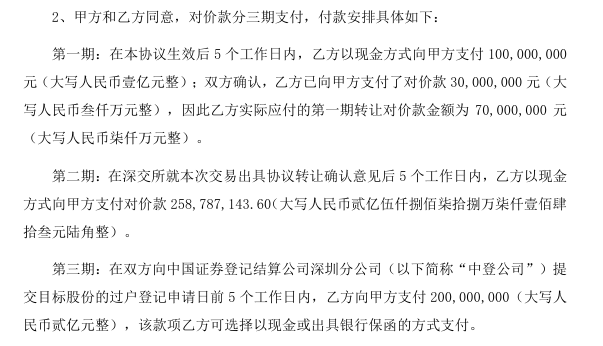 對價(jià)款分三期支付。第一期在本協(xié)議生效后5個(gè)工作日內(nèi),福州千景以現(xiàn)金方式向天凱匯達(dá)支付1億元;雙方確認(rèn),福州千景已向天凱匯達(dá)支付了對價(jià)款3000萬元,因此福州千景實(shí)際應(yīng)付的第一期轉(zhuǎn)讓對價(jià)款金額為7000萬元。第二期在深交所就本次交易出具協(xié)議轉(zhuǎn)讓確認(rèn)意見后5個(gè)工作日內(nèi),福州千景以現(xiàn)金方式向天凱匯達(dá)支付對價(jià)款2.59億元。第三期在雙方向中國證券登記結(jié)算公司深圳分公司提交目標(biāo)股份的過戶登記申請日前5個(gè)工作日內(nèi),福州千景向天凱匯達(dá)支付2億元,可選擇以現(xiàn)金或出具銀行保函的方式支付。