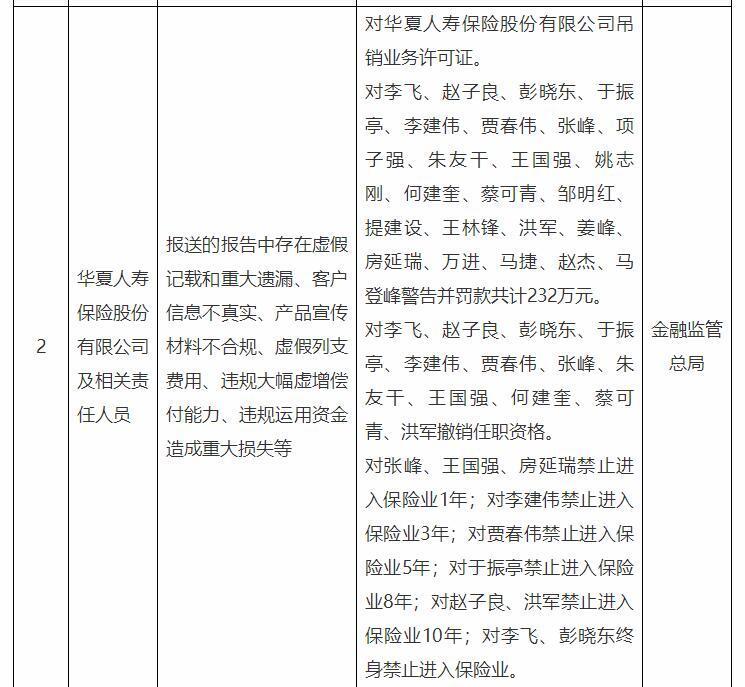 國(guó)家金融監(jiān)督管理總局網(wǎng)站8月1日發(fā)布的行政處罰信息公示列表顯示,華夏人壽保險(xiǎn)股份有限公司及相關(guān)責(zé)任人員報(bào)送的報(bào)告中存在虛假記載和重大遺漏、客戶(hù)信息不真實(shí)、產(chǎn)品宣傳材料不合規(guī)、虛假列支費(fèi)用、違規(guī)大幅虛增償付能力、違規(guī)運(yùn)用資金造成重大損失等。
