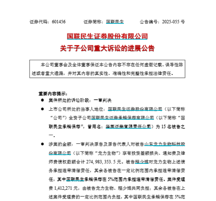 但退市不是終點(diǎn)。此前在2022年8月,國聯(lián)證券(現(xiàn)已更名為國聯(lián)民生證券)發(fā)布《關(guān)于子公司重大訴訟的公告》,公司全資子公司華英證券(已改名為“國聯(lián)民生承銷保薦”)收到濟(jì)南中院送達(dá)的《開庭傳票》等,1600余名投資者訴龍力生物、華英證券、立信所。據(jù)悉,李立群等1628名投資者為原告,訴訟請(qǐng)求為:判令龍力生物賠償各原告的投資差額損失、傭金及印花稅損失等;判令程少博等12名自然人、華英證券、立信所承擔(dān)連帶賠償責(zé)任。