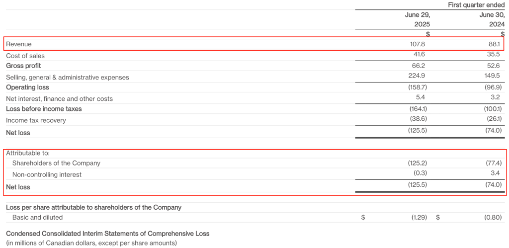 加拿大鵝是全球高性能奢華生活方式品牌,一家定位高端的羽絨服制造公司,創(chuàng)立于1957年。據(jù)加拿大鵝7月31日發(fā)布的截至2025年6月29日的2026財年第一財季財務(wù)業(yè)績顯示,第一財季實(shí)現(xiàn)營收1.078億美元,同比增長22.4%,按固定匯率計(jì)算增長21.5%;歸母凈虧損為-1.252億美元,去年同期為-0.774億美元,虧損同比擴(kuò)大超六成。