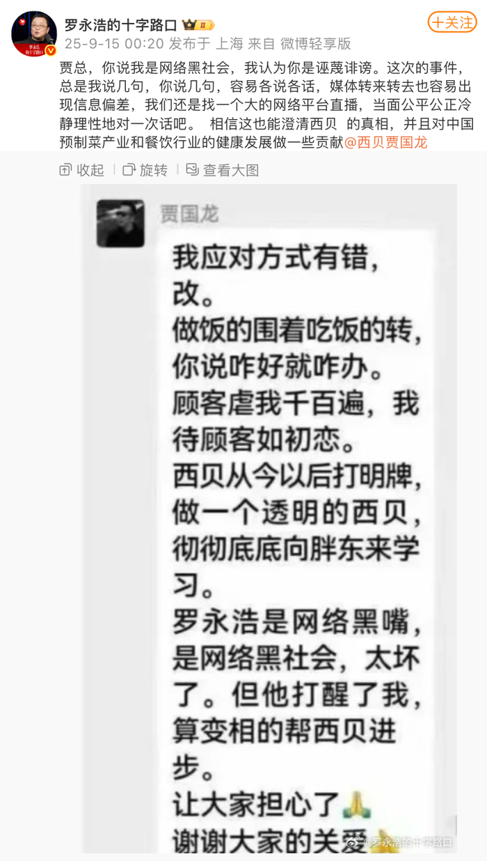 近日,西貝餐飲與羅永浩就預(yù)制菜引發(fā)的爭(zhēng)論在網(wǎng)絡(luò)上持續(xù)發(fā)酵。14日晚間,西貝創(chuàng)始人賈國(guó)龍此前表態(tài)的完整截圖流出,其中除了提到西貝從今以后要打明牌、向胖東來(lái)學(xué)習(xí)外,還將羅永浩稱(chēng)為網(wǎng)絡(luò)黑嘴、網(wǎng)絡(luò)黑社會(huì)。對(duì)此,羅永浩今日凌晨在社交平臺(tái)表示,本次事件中雙方總是各說(shuō)各話(huà),媒體轉(zhuǎn)來(lái)轉(zhuǎn)去也容易出現(xiàn)信息偏差。他提議,雙方找一個(gè)大型網(wǎng)絡(luò)平臺(tái)直播,當(dāng)面對(duì)話(huà)。