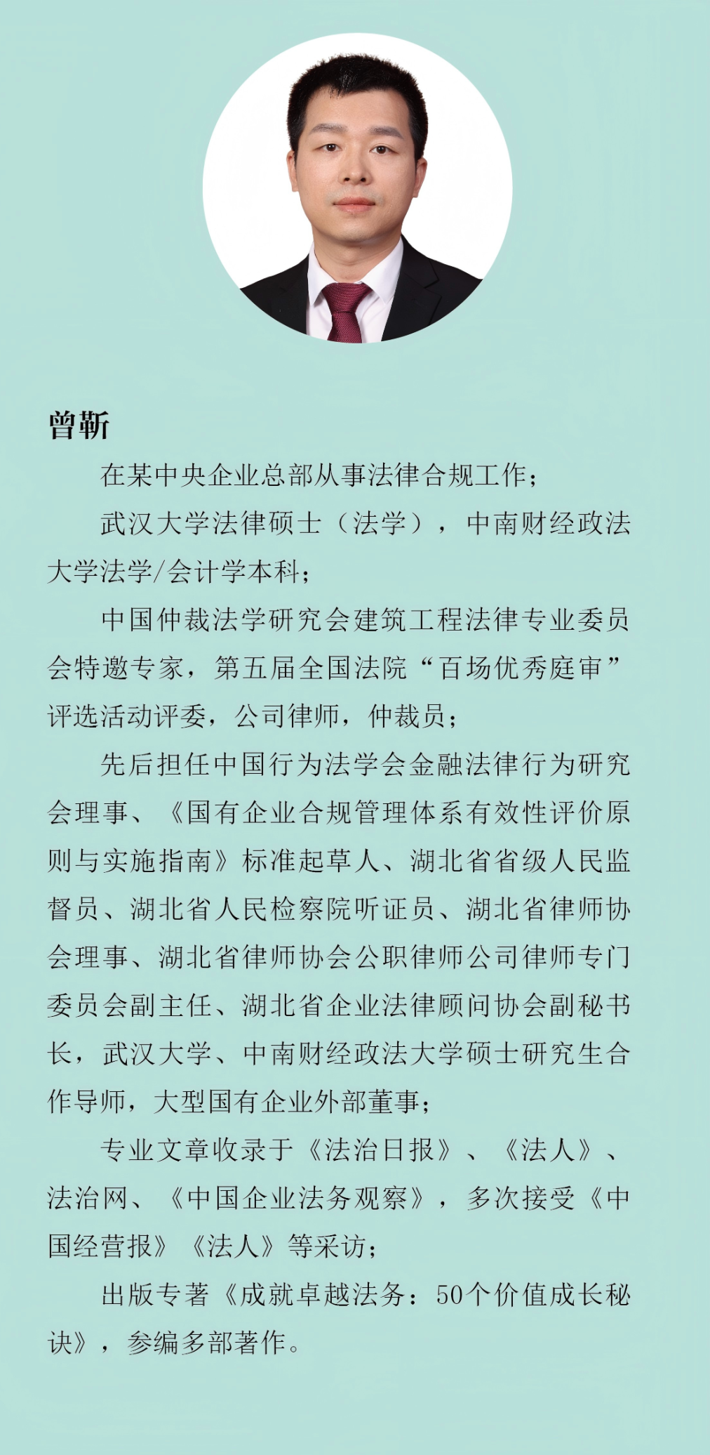 寫書與做學(xué)問一樣,都要講社會責(zé)任。曾靳先后在中南財經(jīng)政法大學(xué)和武漢大學(xué)法學(xué)院深造,受過系統(tǒng)良好的法學(xué)方法訓(xùn)練,投身法務(wù)工作后,依然嚴格地將公正、嚴謹、批判和理性等要素內(nèi)嵌于法律思維中,讓這份對法律的熱愛和忠忱幽然生花,熠熠生輝。于此,我欣喜地看見本書的誕生,關(guān)注著他的不斷成長,希望他繼續(xù)心懷使命、筆耕不輟,為構(gòu)建法律職業(yè)共同體承擔(dān)屬于自己的那份責(zé)任。