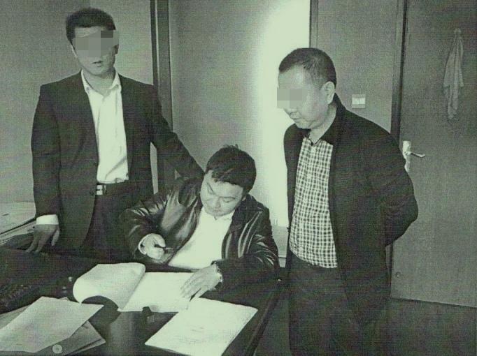 樂山市商業(yè)銀行兩名工作人員與假冒擔(dān)保方銀行工作人員的殷學(xué)明(中)在“面簽”現(xiàn)場(chǎng)。受訪者提供 資料圖