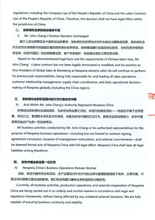 10月23日,安世半導(dǎo)體中國有限公司發(fā)布聲明稱,近期荷蘭總部單方面免去張秋明銷售市場(chǎng)部副總裁職務(wù)的決定,在中國法域下不發(fā)生法律效力。