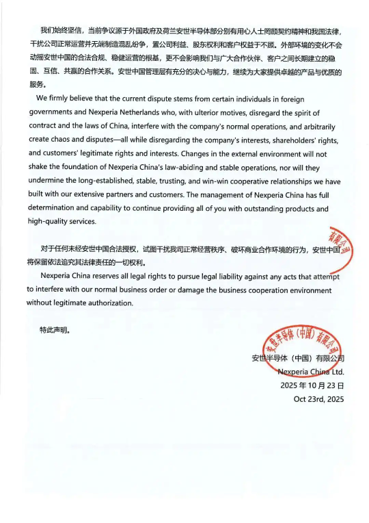 四、安世中國業(yè)務(wù)運(yùn)營一切正常,目前,安世中國所有業(yè)務(wù)活動(dòng)、生產(chǎn)運(yùn)營及對(duì)外合作均在法律與管理制度框架下有序、正常開展,不受任何外部單方面決定的影響。我們完全有能力確保業(yè)務(wù)的連續(xù)性與穩(wěn)定性。