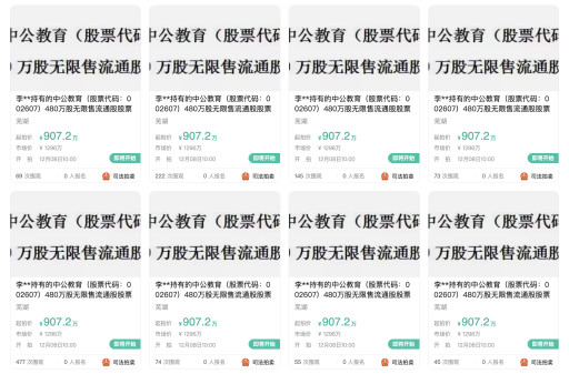 阿里資產(chǎn)司法平臺(tái)顯示,上述4800萬(wàn)股股份被分為10個(gè)標(biāo)的,每一個(gè)標(biāo)的物“李**持有的中公教育(股票代碼:002607)480萬(wàn)股無(wú)限售流通股股票”的起拍價(jià)為907.2萬(wàn)元。