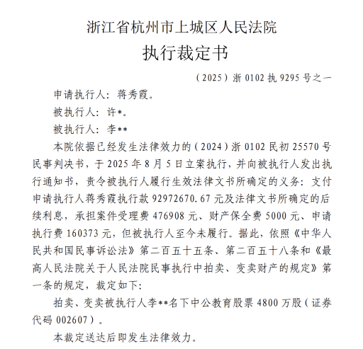 根據(jù)司法拍賣(mài)平臺(tái)披露的浙江省杭州市上城區(qū)人民法院執(zhí)行裁定書(shū),法院依據(jù)已經(jīng)發(fā)生法律效力的(2024)浙0102民初25570號(hào)民事判決書(shū),于2025年8月5日立案執(zhí)行,并向被執(zhí)行人發(fā)出執(zhí)行通知書(shū),責(zé)令被執(zhí)行人履行生效法律文書(shū)所確定的義務(wù):支付申請(qǐng)執(zhí)行人蔣秀霞執(zhí)行款92972670.67元及法律文書(shū)所確定的后續(xù)利息,承擔(dān)案件受理費(fèi)476908元、財(cái)產(chǎn)保全費(fèi)5000元、申請(qǐng)執(zhí)行費(fèi)160373元,但被執(zhí)行人至今未履行。據(jù)此,依照《中華人民共和國(guó)民事訴訟法》第二百五十五條、第二百五十八條和《最高人民法院關(guān)于人民法院民事執(zhí)行中拍賣(mài)、變賣(mài)財(cái)產(chǎn)的規(guī)定》第一條的規(guī)定,裁定拍賣(mài)、變賣(mài)被執(zhí)行人名下中公教育股票4800萬(wàn)股(證券代碼002607)。