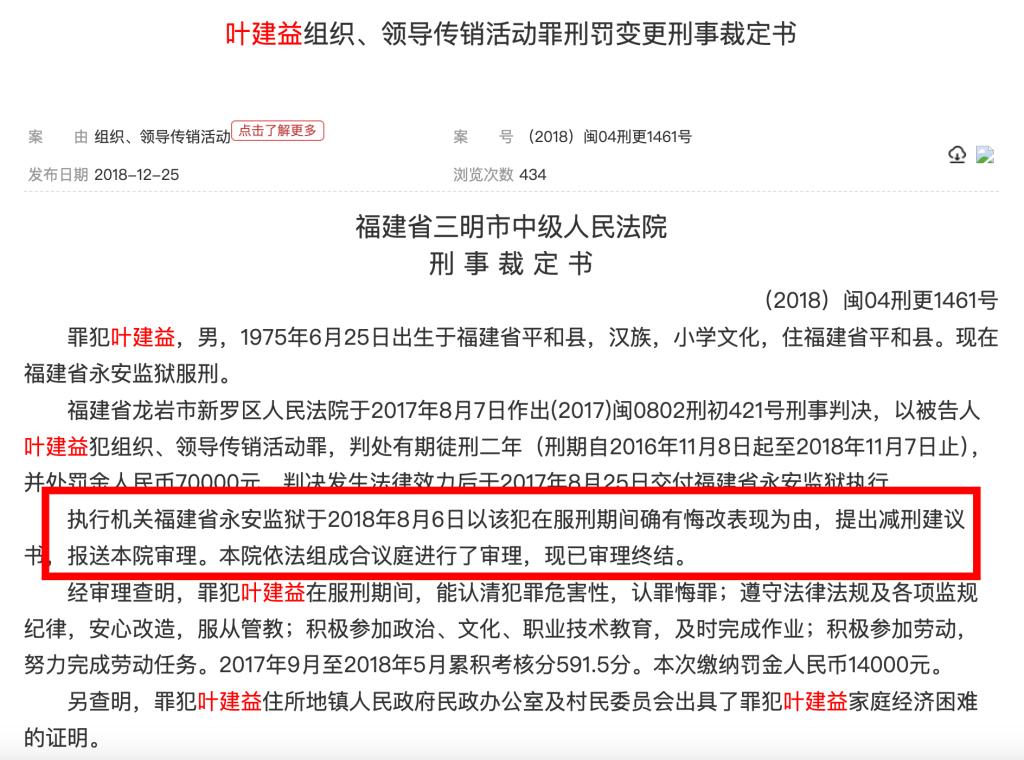 2018年12月,中國裁判文書網另披露過一份《葉建益組織、領導傳銷活動罪刑罰變更刑事裁定書》,福建省三明市中級人民法院公開的一份刑事裁定書顯示,執(zhí)行機關福建省永安監(jiān)獄于2018年8月6日以該犯在服刑期間確有悔改表現(xiàn)為由,提出減刑建議書,報送本院審理。本院認為,罪犯葉建益在服刑期間確有悔改表現(xiàn),符合減刑條件。裁定:對罪犯葉建益減去有期徒刑二個月,刑期自2016年11月8日起至2018年9月7日止。