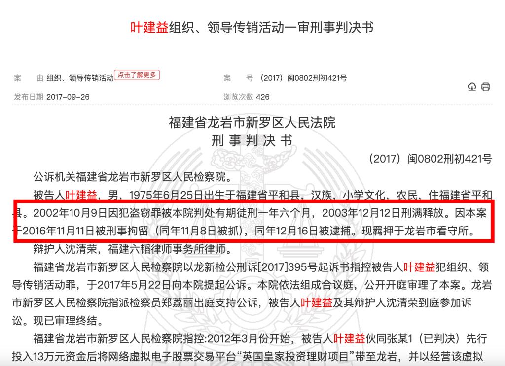 澎湃新聞根據(jù)中國裁判文書網檢索發(fā)現(xiàn),福建省龍巖市新羅區(qū)人民法院于2017年9月公開的一份刑事判決書顯示,葉建益1975年出生,小學文化,2002年因盜竊罪獲刑一年六個月,于2003年12月釋放;2016年又因組織、領導傳銷活動罪被判處有期徒刑二年,涉案60余人、涉案金額130余萬元。