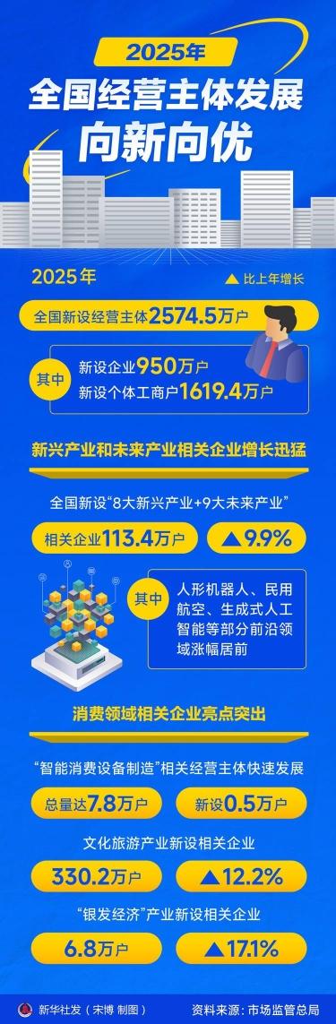 新華社北京2月26日電(記者王悅陽)記者2月26日從市場監(jiān)管總局獲悉,2025年全國新設經(jīng)營主體2574.5萬戶。其中,新設企業(yè)950萬戶,新設個體工商戶1619.4萬戶。經(jīng)營主體呈現(xiàn)向新向優(yōu)發(fā)展態(tài)勢,為高質(zhì)量發(fā)展蓄勢聚能。