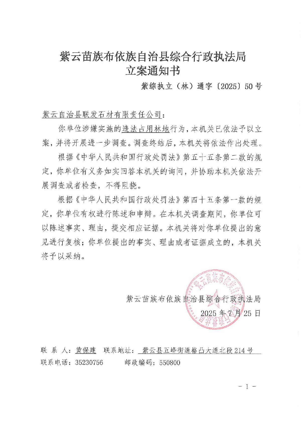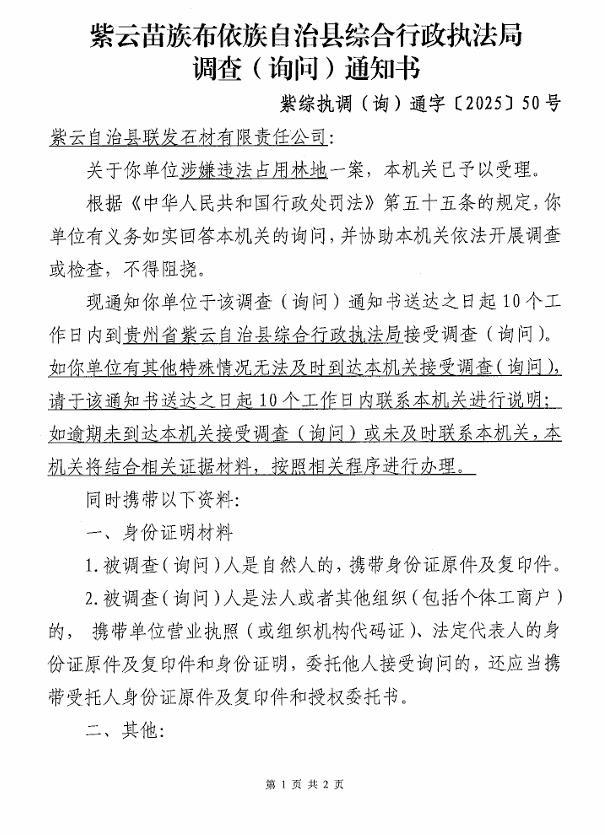 因你公司涉嫌在貴州省紫云自治縣貓營鎮(zhèn)普卡橋村違法占用林地一案,我機關依法向你公司公告送達《立案通知書》【紫綜執(zhí)立(林)通字〔2025〕50號】及《調查(詢問)通知書》【紫綜執(zhí)調(詢)通字〔2025〕50號】。請于本公告送達之日起10個工作日內到本機關接受調查、詢問(地址:貴州省紫云自治縣五峰街道格凸大道北段214號;電話:0851-35230756),進行陳述、申辯。逾期未聯系本機關,本機關將依法處理。如對公告送達方式有異議,請于本公告發(fā)布之日起7個工作日內提出異議,若逾期未提出異議,上述文書自本公告發(fā)出之日起三十日,即視為送達。(見本公告后請聯系本機關簽收上述文書)