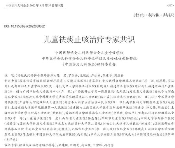 近日,由中國(guó)醫(yī)師協(xié)會(huì)兒科醫(yī)師分會(huì)兒童呼吸專家組、中華醫(yī)學(xué)會(huì)兒科學(xué)分會(huì)兒科呼吸學(xué)組兒童慢性咳嗽協(xié)作組、《中國(guó)實(shí)用兒科雜志》編輯委員會(huì)發(fā)起,組織全國(guó)40位專家制定了《兒童祛痰止咳治療專家共識(shí)》,該共識(shí)發(fā)布于中國(guó)實(shí)用兒科雜志2022年8月第37卷第8期。