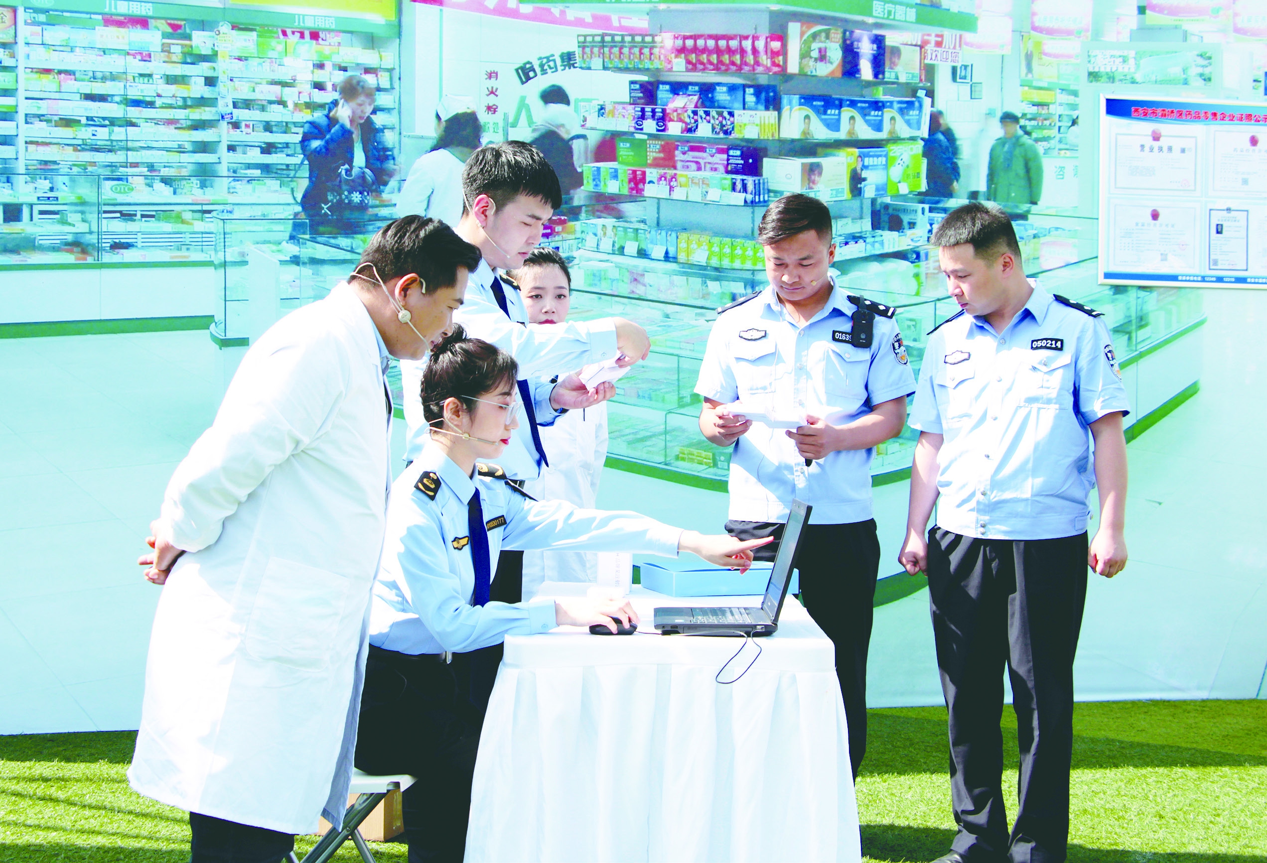 圖為在演練現(xiàn)場(chǎng)灞橋區(qū)市場(chǎng)監(jiān)管局聯(lián)合西安市公安局灞橋分局模擬對(duì)涉事藥品企業(yè)展開調(diào)查。賀一辰 攝