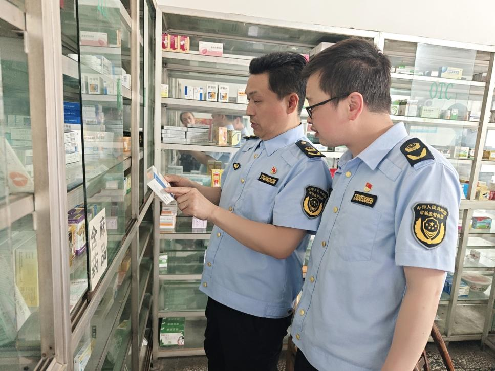 南漳縣市場(chǎng)監(jiān)管局執(zhí)法人員對(duì)“華康藥房”進(jìn)行執(zhí)法檢查。 吳采平/攝