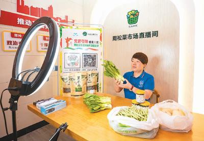 一名主播在浙江省瑞安市玉海街道周松菜市場網(wǎng)絡(luò)直播間銷售農(nóng)產(chǎn)品。孫凜攝(人民圖片)