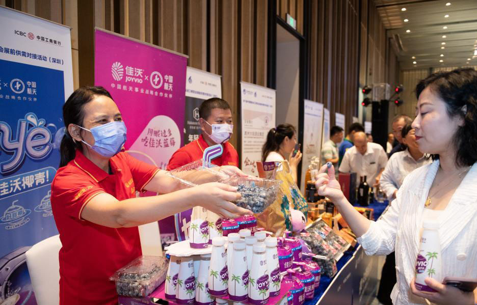 8月29日,在廣東省深圳市舉行的進(jìn)博會(huì)展前供需對(duì)接活動(dòng)上,參展商(左)向采購(gòu)商介紹進(jìn)口藍(lán)莓。