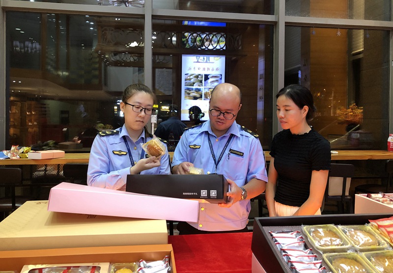 市場(chǎng)監(jiān)督管理局工作人員正在銷售店內(nèi)檢查月餅包裝情況。海南省市場(chǎng)監(jiān)督管理局供圖