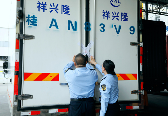 市場監(jiān)管部門駐點監(jiān)管人員對準備發(fā)往學青會運動員村的食品專用運輸車輛張貼封條。何正君攝