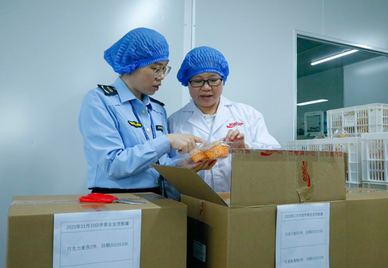 “這個產品的生產日期是11月6日,你們對該批次生產的產品抽檢過了嗎?”“當天生產出來就已經抽檢了,包括我們自己的一個出廠檢驗和第三方檢驗機構抽檢……”11月8日,在南寧經開區(qū)一家糕點生產企業(yè),南寧市市場監(jiān)管局經開分局駐點監(jiān)管人員正在對準備發(fā)往學青會運動員村的糕點進行開箱檢查,重點查看糕點的標簽、生產記錄等。