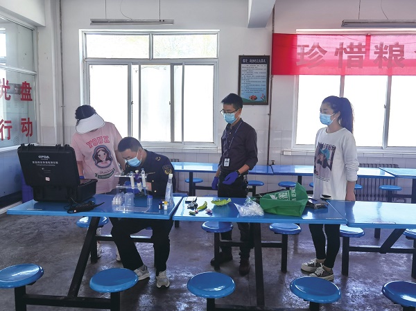 圖為華亭市策底鎮(zhèn)市場(chǎng)監(jiān)管部門(mén)執(zhí)法人員在轄區(qū)一所學(xué)校餐廳對(duì)抽樣的食材進(jìn)行現(xiàn)場(chǎng)快檢。于紅霞 史安良 文/攝