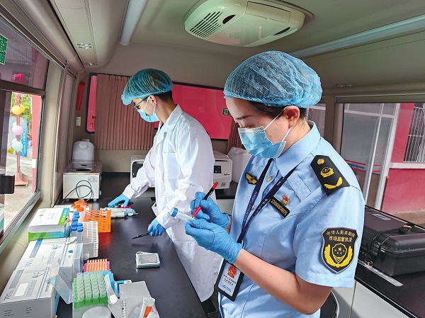 中、高考期間,重慶市南岸區(qū)市場監(jiān)管局組織工作人員深入考點(diǎn),現(xiàn)場開展食品安全快速檢測(cè)。(荊杰 謝旺)