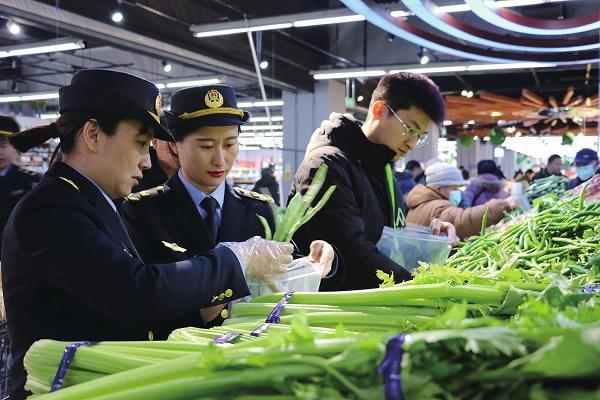 圖為工作人員在農(nóng)貿(mào)市場內(nèi)快檢。王丹本報(bào)記者 謝旺 文/攝