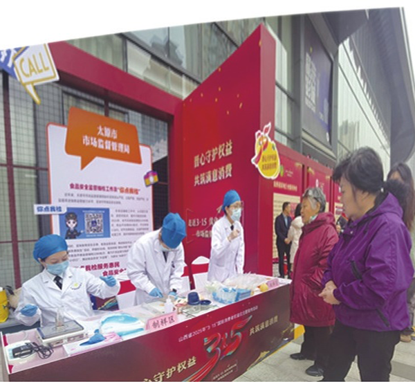 在安徽省合肥市活動(dòng)現(xiàn)場(chǎng),省市兩級(jí)市場(chǎng)監(jiān)管部門工作人員向消費(fèi)者宣講食品安全知識(shí),推介“你點(diǎn)我檢”活動(dòng),提供“你送我檢”快速檢測(cè)服務(wù)。
