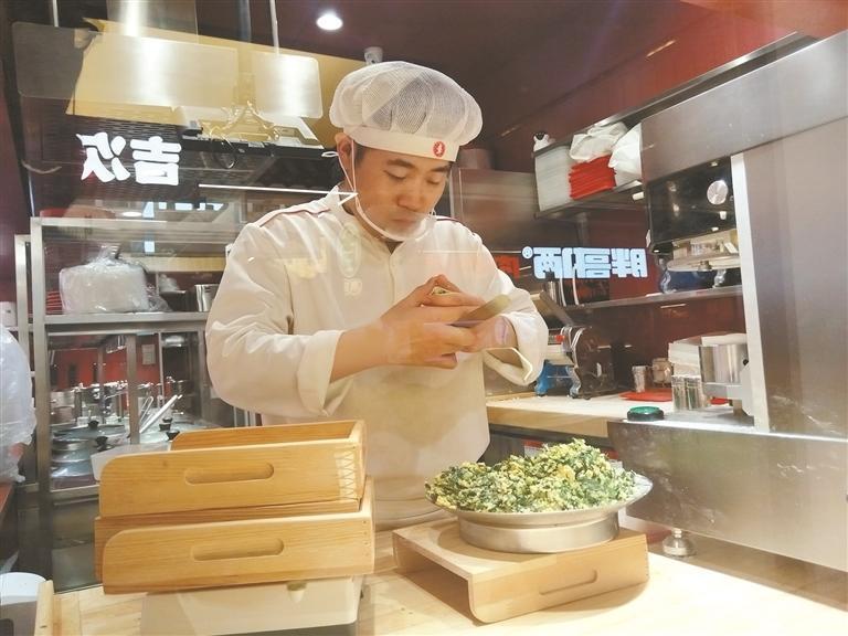 4月8日,在西安市老城根街區(qū)的“蓮湖區(qū)明廚亮灶智慧監(jiān)管示范街”,一家餐飲店的廚師在后廚包餃子。透過玻璃墻,顧客及行人可以看到后廚狀況。