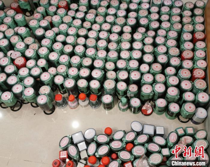 圖為警方繳獲的部分涉案空殼公司公章。重慶市公安局供圖