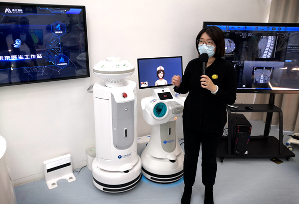 圖為工作人員為記者介紹曾經(jīng)用在新冠肺炎疫情防控一線的智能消殺機器人。人民網(wǎng)記者 孫博洋攝