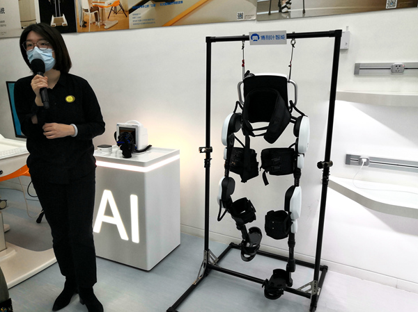 張江人工智能島AI體驗中心工作人員為記者講解人工智能在醫(yī)療方面的應用,圖為下肢外骨骼康復機器人。人民網(wǎng)記者 孫博洋攝