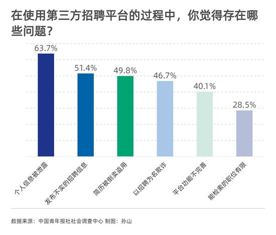 調查顯示,63.7%的受訪者覺得第三方招聘平臺存在信息泄露問題,51.4%的受訪者覺得存在發(fā)布不實招聘信息的問題。其他問題還有:簡歷被倒賣盜用(49.8%)、以招聘為名欺詐(46.7%)、平臺功能不完善(40.1%)和能檢索的職位有限(28.5%)等。