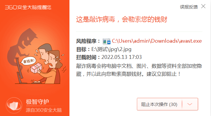 不過,Mallox勒索病毒不斷變換特征的伎倆,并不能騙過360安全大腦。在發(fā)現(xiàn)病毒后,360終端安全產(chǎn)品快速進(jìn)行了響應(yīng),通過上新安全補(bǔ)丁幫助政企客戶保護(hù)財(cái)產(chǎn)安全。在此,360鄭重提示,存在相應(yīng)風(fēng)險(xiǎn)的用戶,應(yīng)盡快部署360終端安全產(chǎn)品,以應(yīng)對此類攻擊問題。
